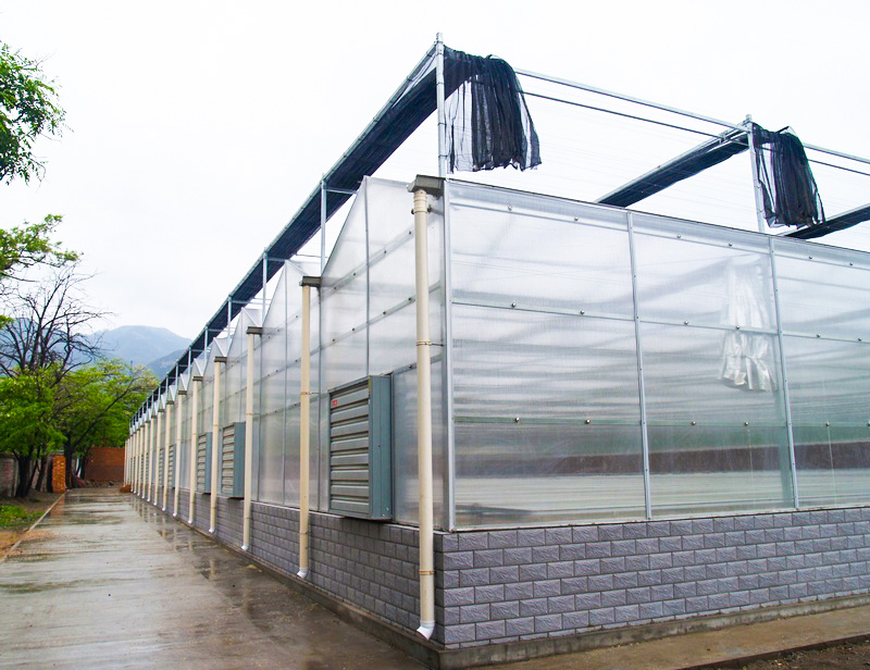 内层防结露的聚碳酸酯中空板,四周墙体按照常规要求为聚碳酸酯中空板或玻璃,根据地区气候条件的差异,在一些寒冷地区(吉林、黑龙江等地),北墙体可采用保温复合板,还可以安装推拉窗,增加温室通风面积。